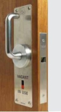 The LaviLock face plate provides clear signage for “Vacant” or “In Use” on the outside, and bold letters showing locking and unlocking directions on the inside door face.